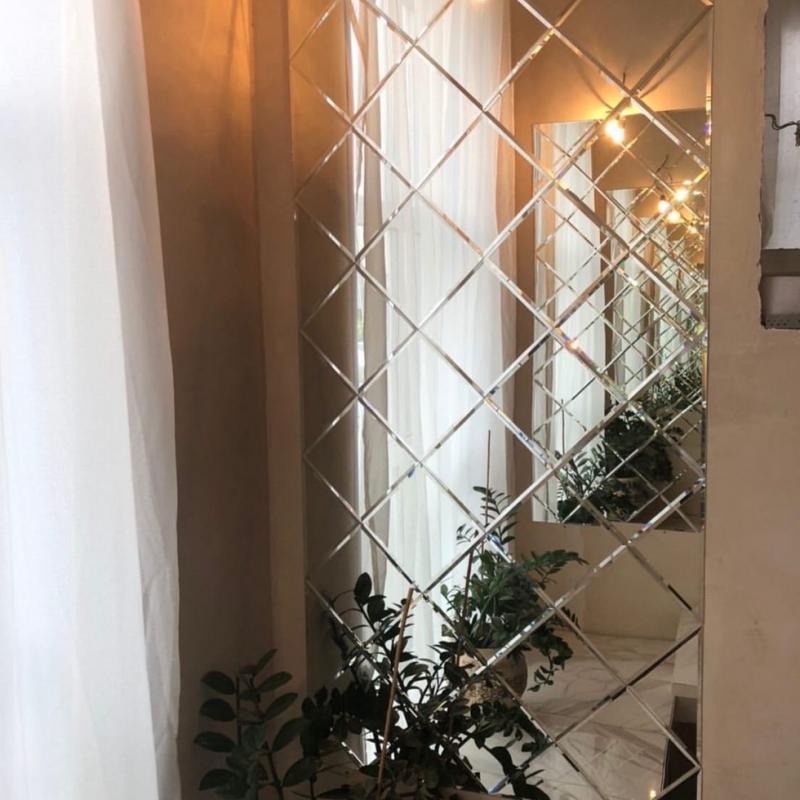 Использована серебристая квадратная зеркальная плитка